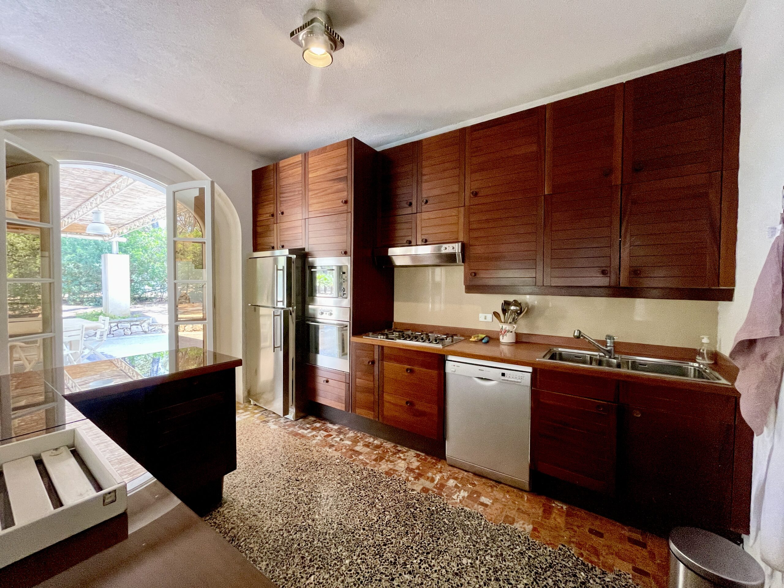 The architect designed villa boasts a bright spacious open plan living space of 100 sq m on the ground floor. The sunken living area is complete with welcoming fireplace and large glass doors looking out over the mature gardens and pool. The stunning venetian terrazzo flooring continues outside  adding to the natural flow from indoors to outdoors. The dining area boasts a magnificent oak table that seats 16 people and the bespoke kitchen with central island makes for a very social space. The kitchen opens out to the shady terrace with fabulous trani stone table perfect for long lunches poolside.