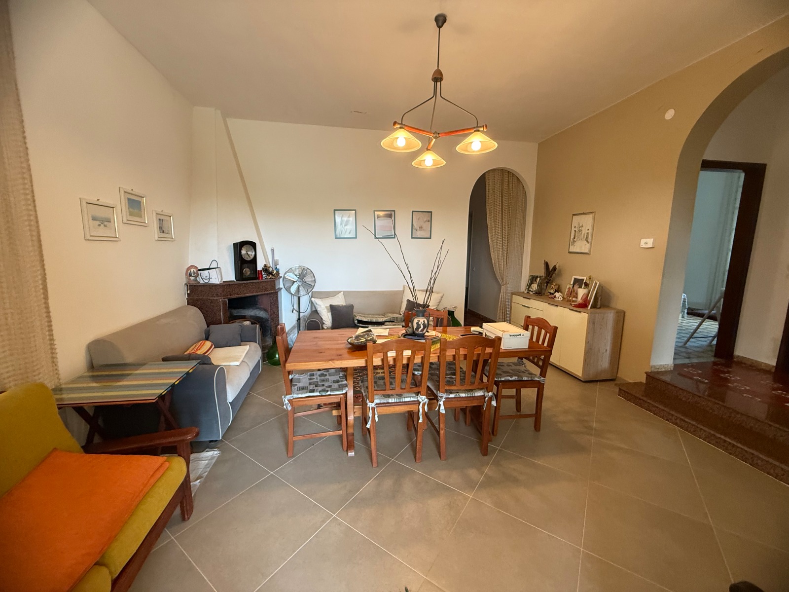 The main entrance opens into a bright 25 sqm living room with fireplace and a window facing the veranda. From here, you access: